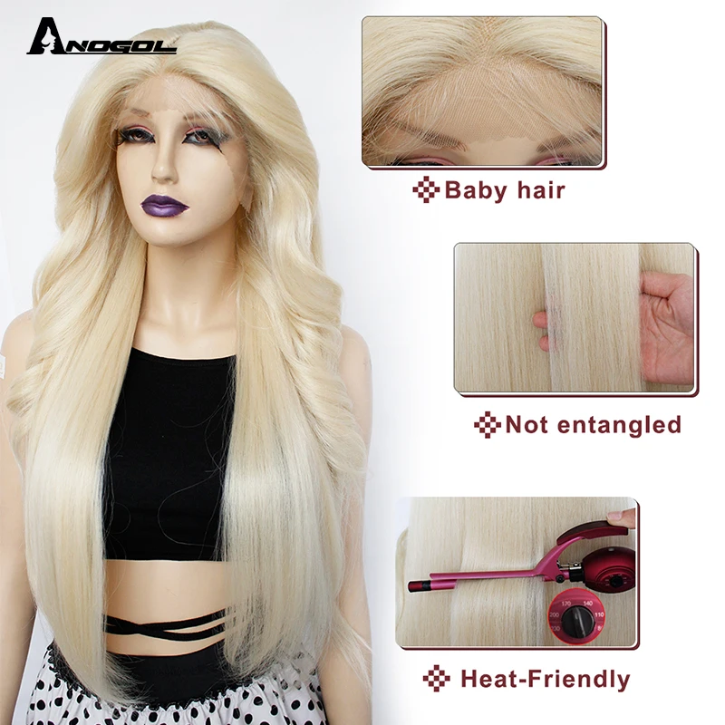 Anogol Brown Long Body Wave Synthetic Lace Front Wigs Futura Fiber Gold Blonde For Women Heat Resis